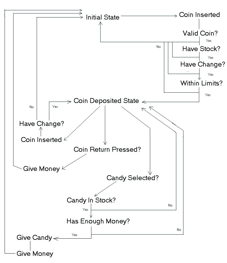 Although far from decribing in complete detail all the operations of the vending machine, this top-level diagram will give you the general idea of how things should work in the program. It describes graphically what I have gone over in the preceeding page.